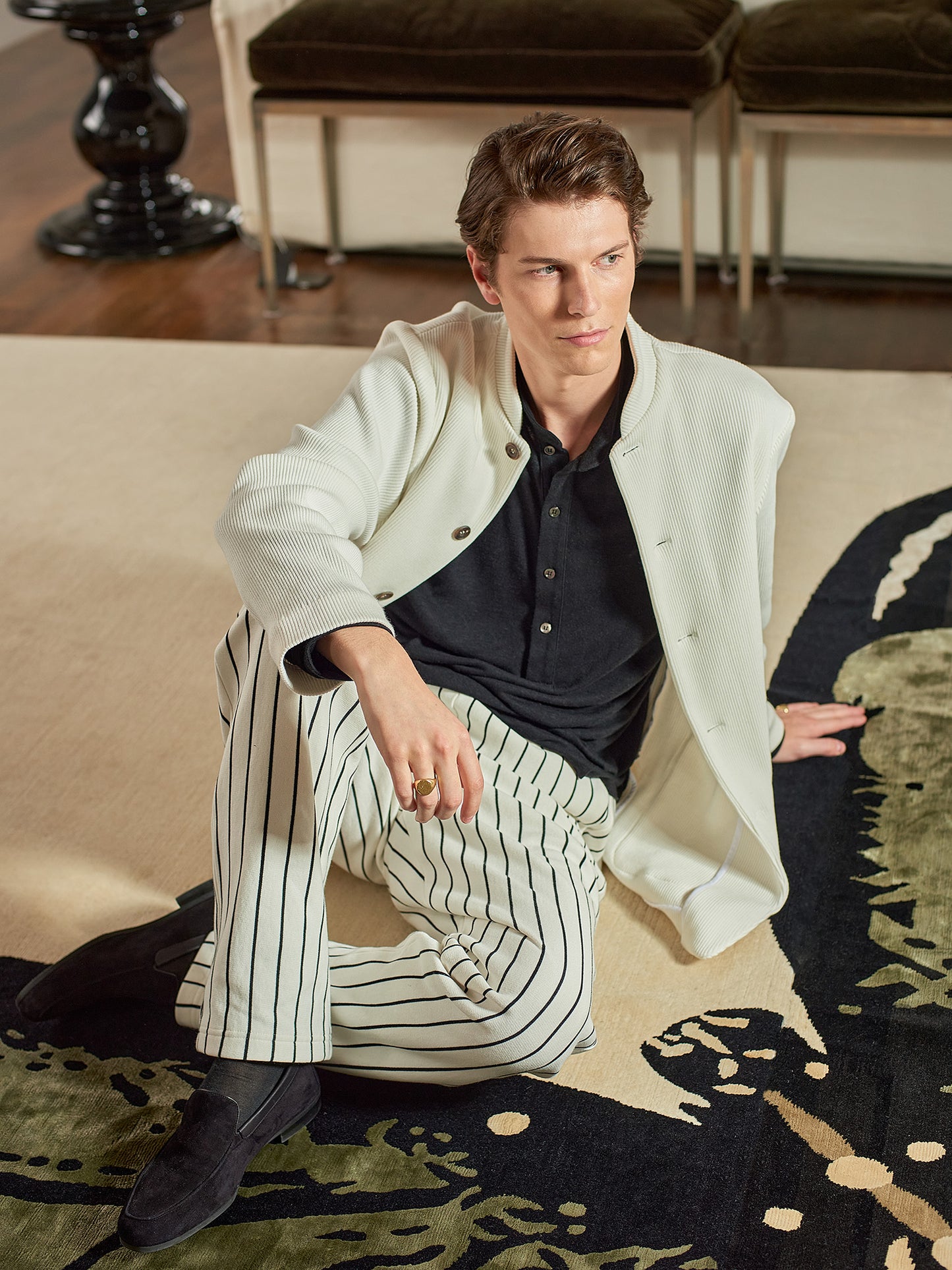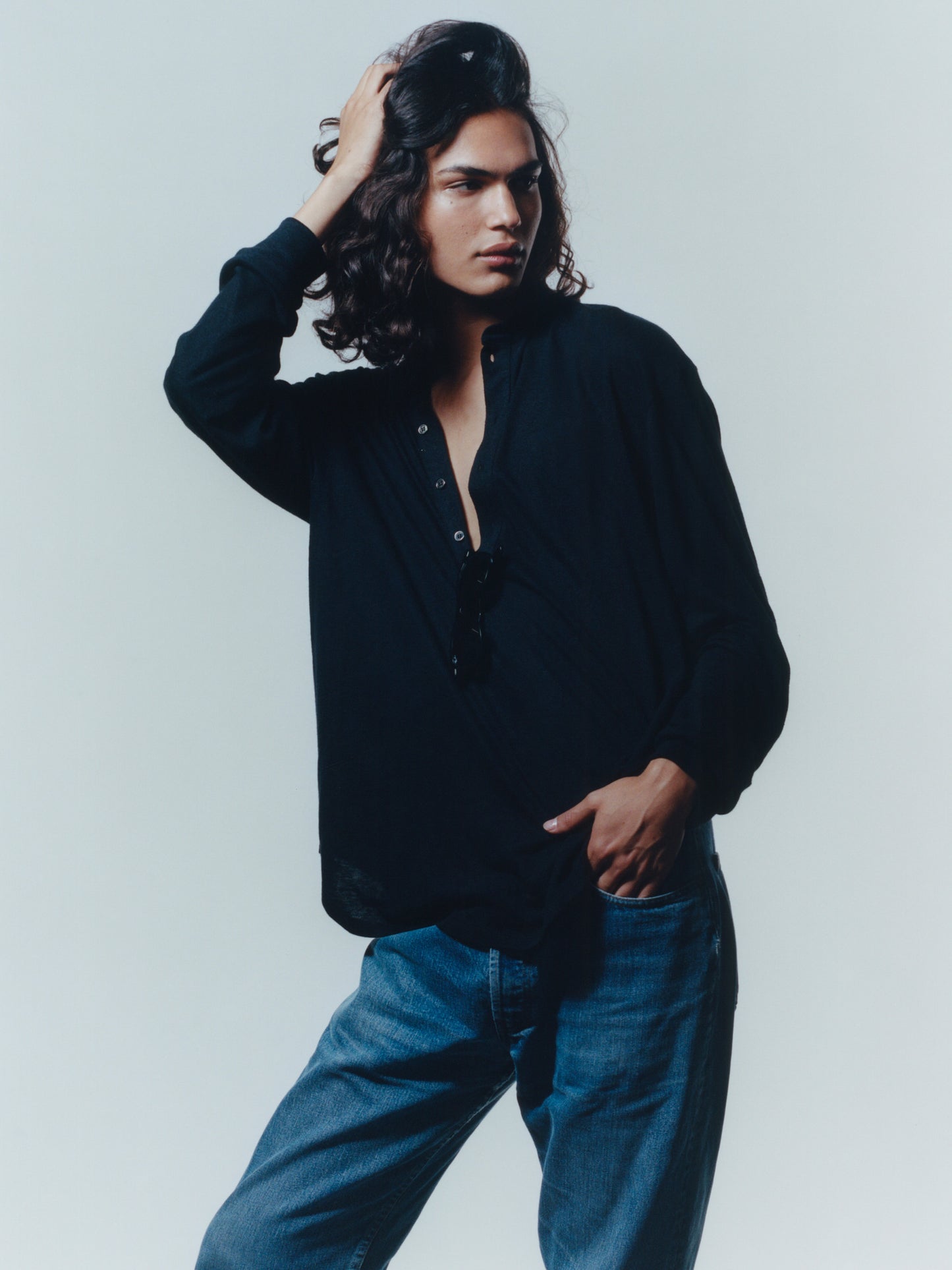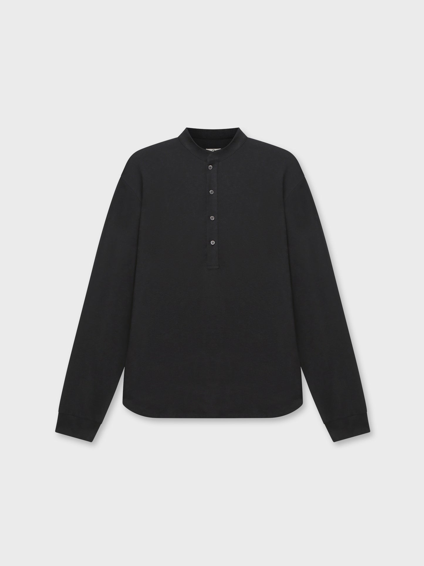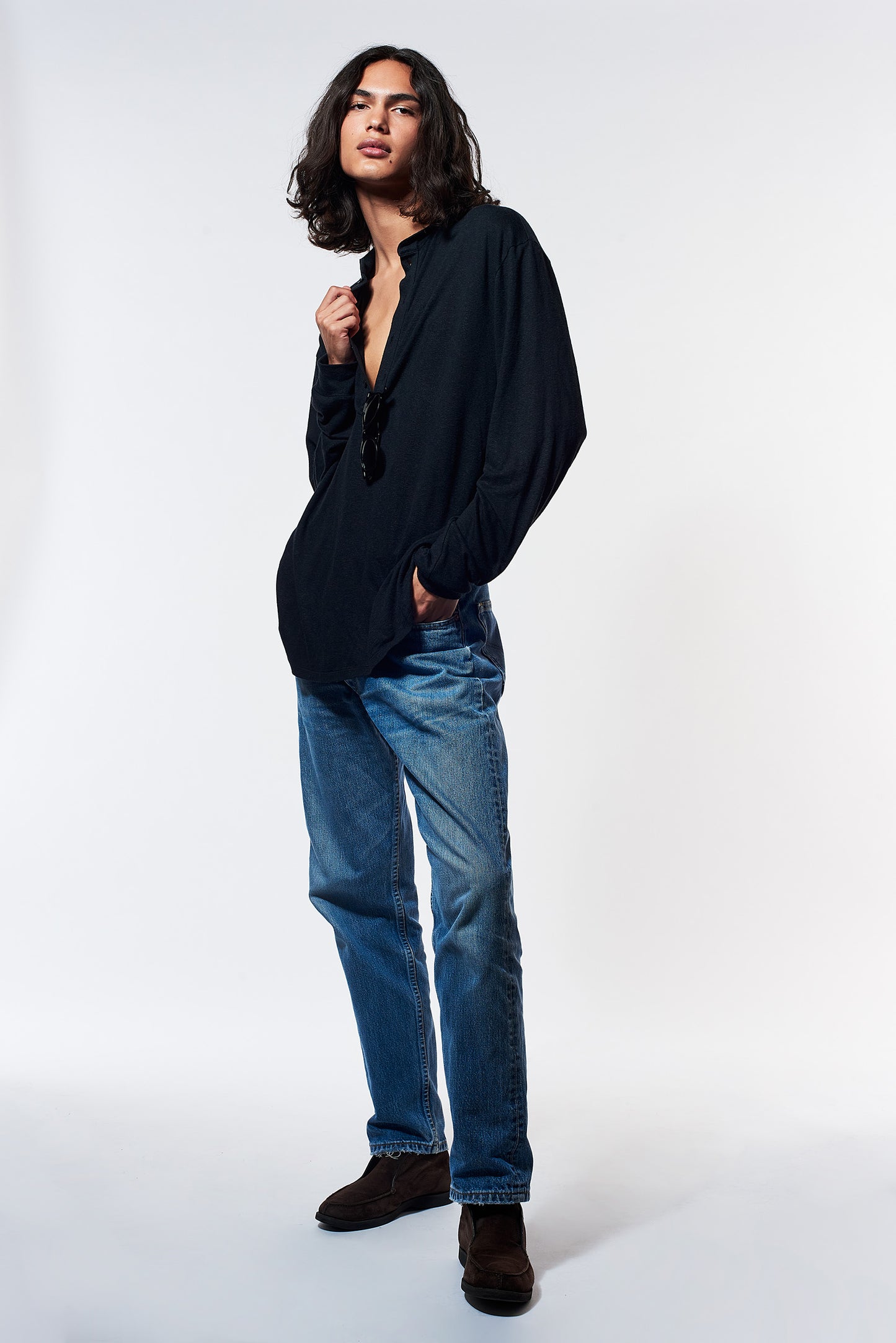 A black linen polo shirt, draped with the nonchalance of viscose and the refinement of a grandad collar. The elegance of black, the ease of a polo—timeless, reinvented, unhurried.
