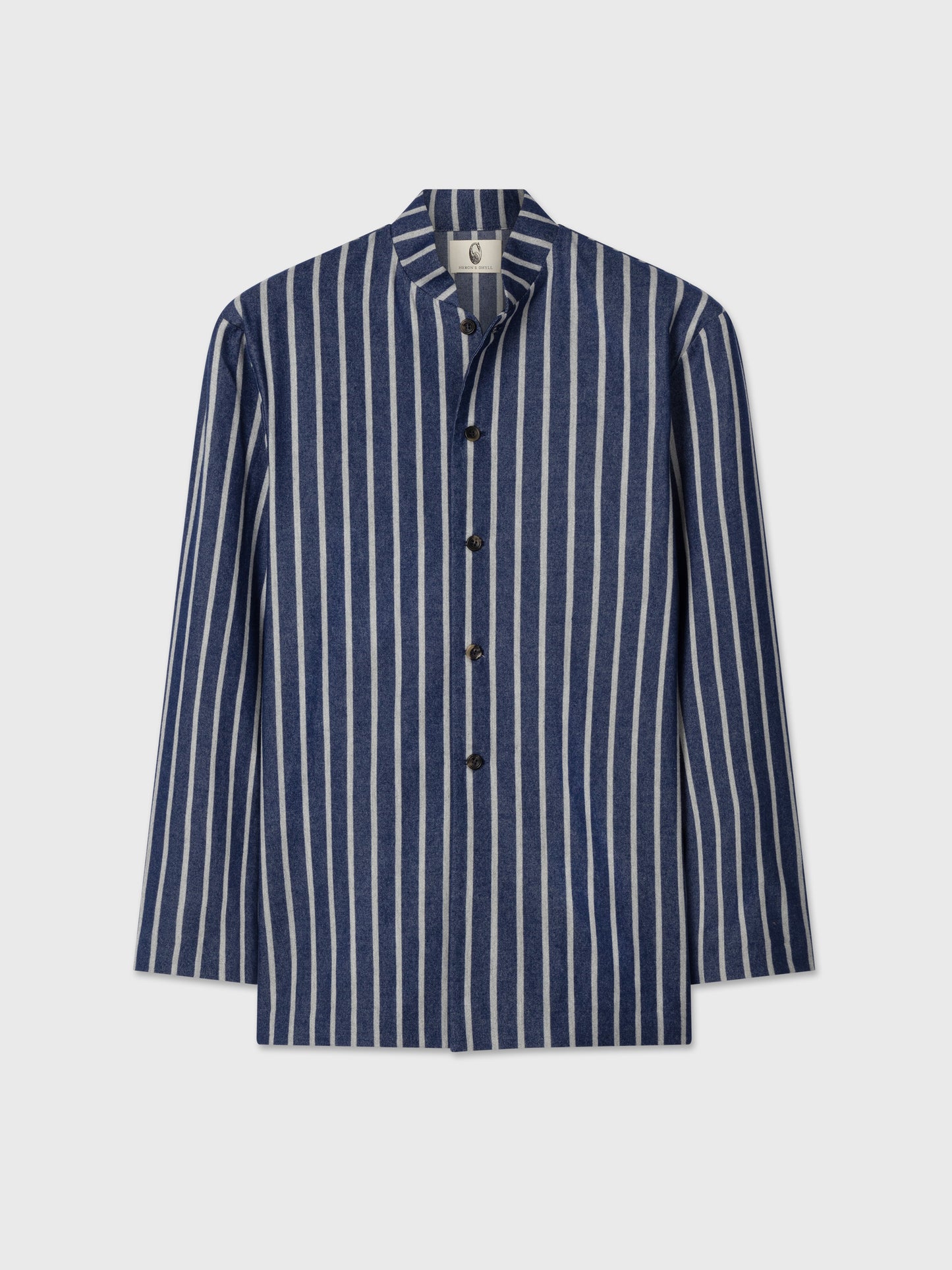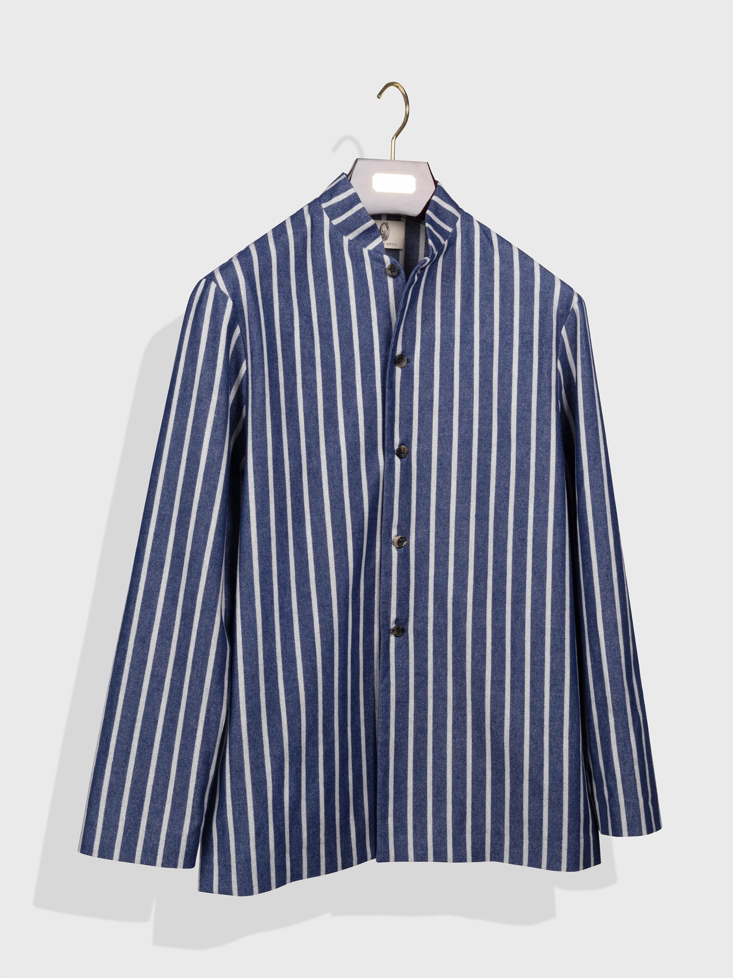 The navy striped Nehru jacket evokes a cosmopolitan air, its Bengal-striped brushed cotton exuding both depth and restraint. Unstructured yet deliberate, it tempers its soft form with the precision of matte horn buttons—a statement of understated elegance.